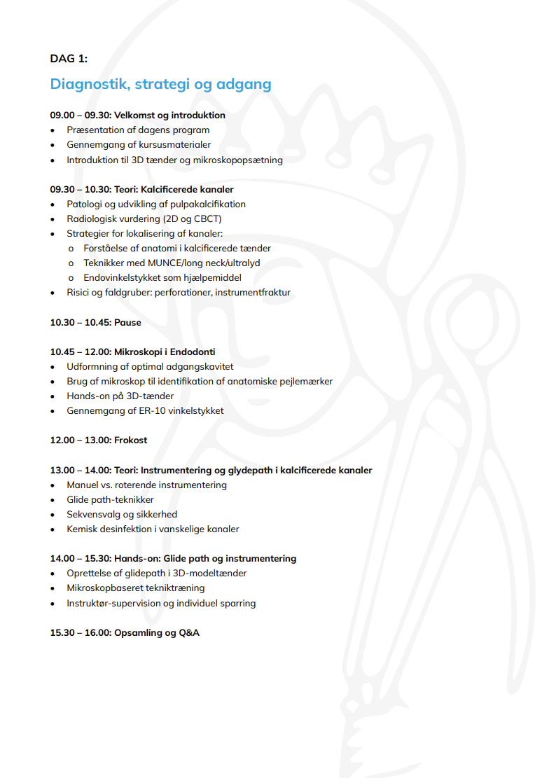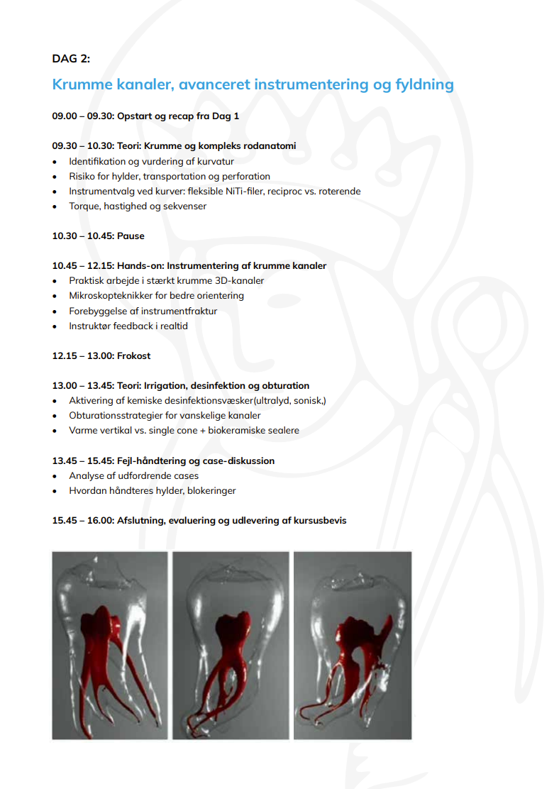 Dette intensive 2-dages kursus giver dig hands-on erfaring og praksisnære teknikker til sikkert og effektivt at behandle nogle af endodontiens største udfordringer: kalcificerede kanaler og stærkt krumme kanaler.